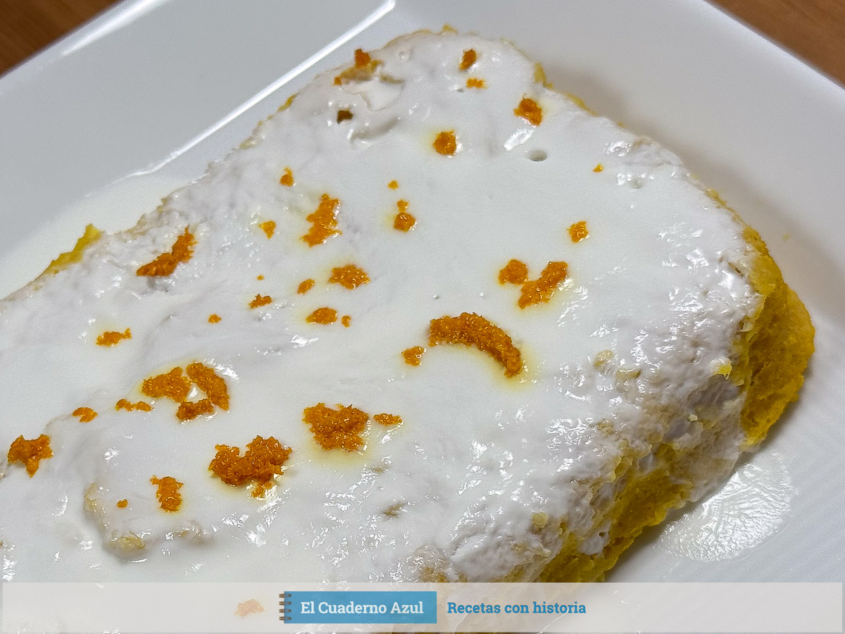 - Añade la cobertura: Si deseas, mezcla el yogur griego con la ralladura de naranja y vierte sobre la superficie del bizcocho. Decora con más hebras de ralladura y sirve enseguida o refrigera 15 minutos para que quede más fresco.