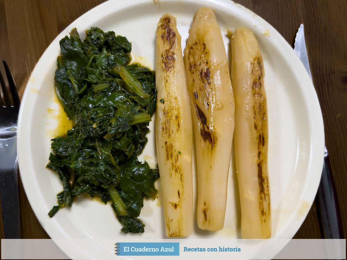 Un plato simple y saludable donde los espárragos blancos gruesos se doran ligeramente a la plancha y se acompañan con unas acelgas rehogadas con ajo. Ideal como entrante ligero o como guarnición para carnes o pescados. Se prepara sin complicaciones y se sirve al momento.