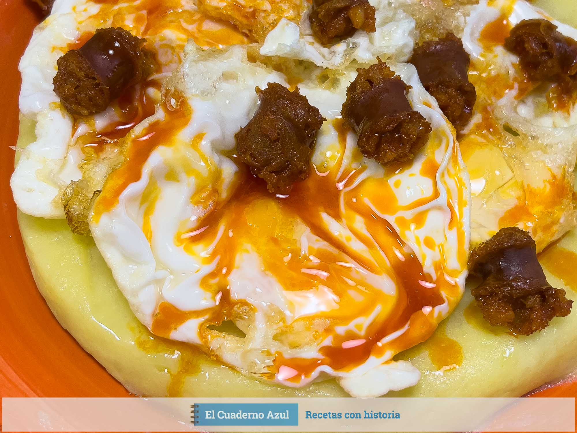 - Para montar el plato, coloca una base generosa de puré de patata en cada plato. Sobre éste, distribuye los huevos fritos y los trozos de chorizo.