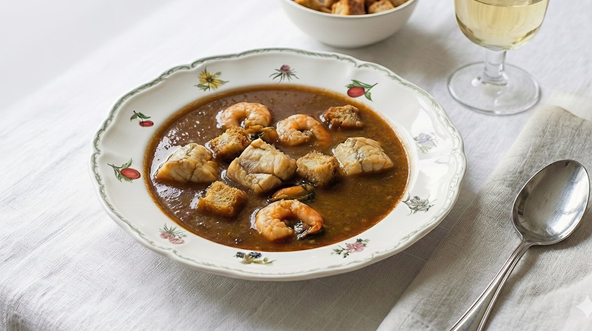 Rojiza y potente. El secreto está en tostar bien las cáscaras para el fumet. Es un plato económico si compras bien el producto.