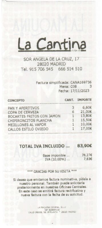 Nuestra visita a La Cantina fue satisfactoria. Es un restaurante que ofrece buena comida en un ambiente agradable, con un servicio que se preocupa por los detalles. Aunque no es un lugar de alta cocina, cumple perfectamente con lo que promete: platos tradicionales bien hechos en un ambiente cómodo. Es un lugar recomendable para quienes buscan una comida informal pero de calidad en Madrid.