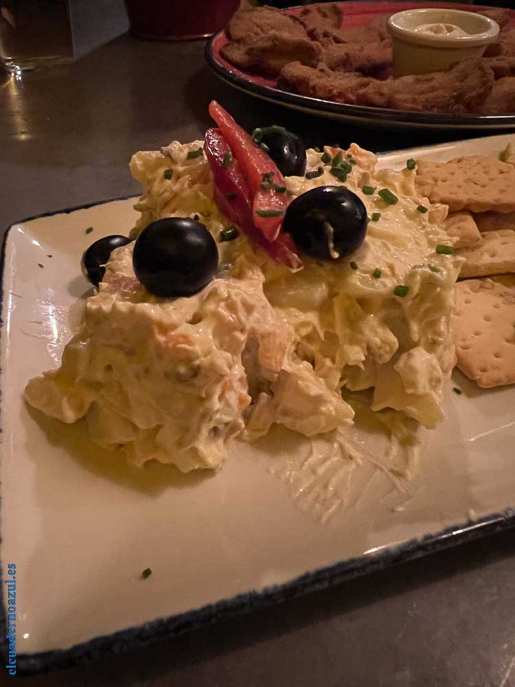 - Ensaladilla con gamba de cristal, mayonesa de cilantro y copos de bonito deshidratados